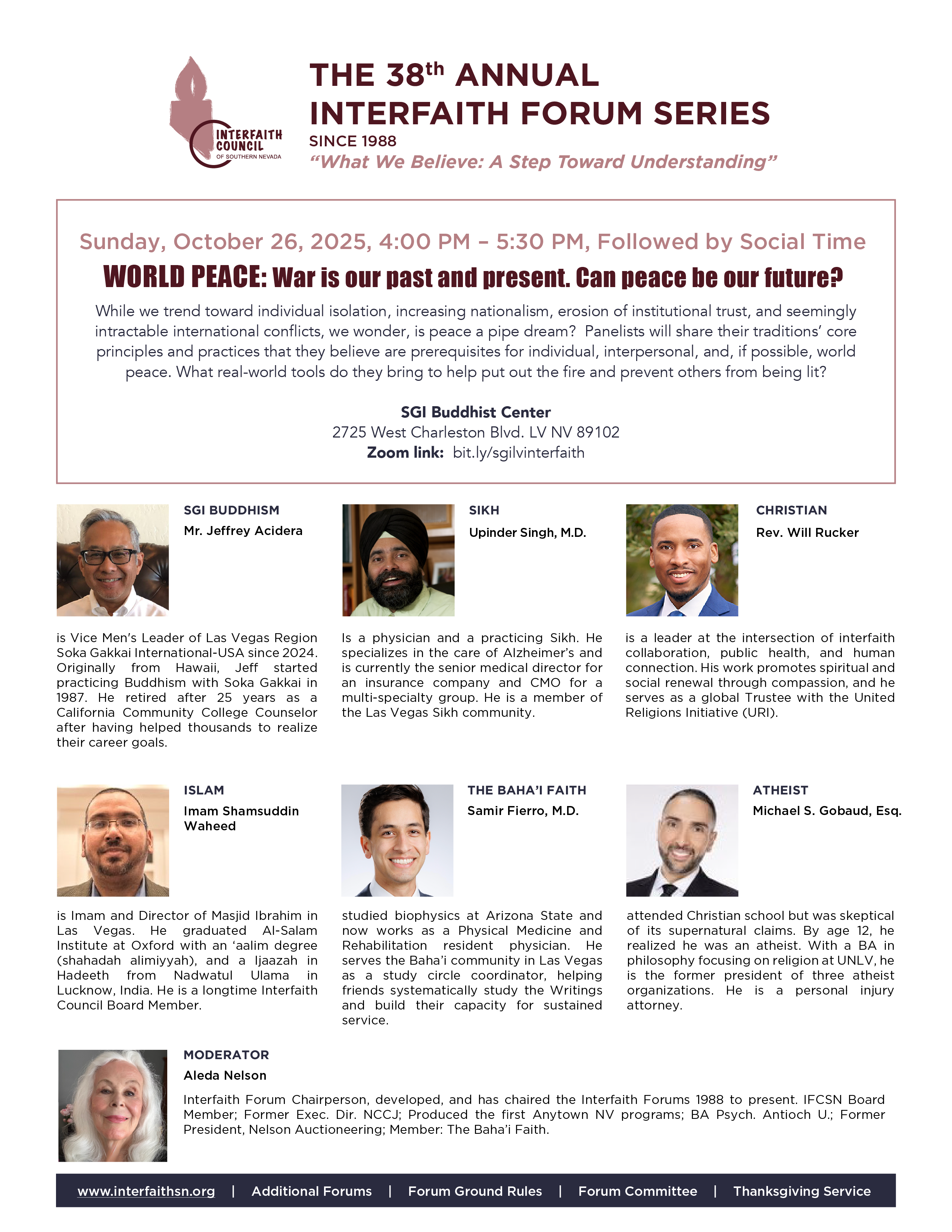 In a world torn apart by religious misunderstanding, the goal of the Interfaith Forums is to provide an experience where people can hear different religions’ perspectives in an environment of mutual respect. It is a time and place to hear and be heard. Since 1988 the forums have helped forge strong relationships between members of Southern Nevada’s diverse religious communities.